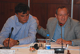 Roger Roth, Chair of the FISU CTI for winter sports, introducing Muhtar Kurt, President of the Technical Committee within the Erzurum Organizing Committee
