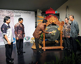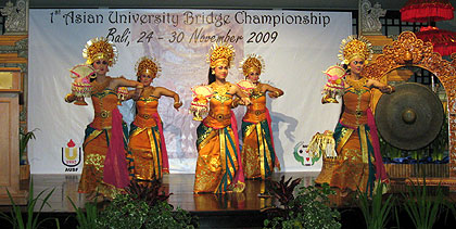 At 7: 30 pm, the Opening Ceremony of the 1st Asian University Bridge Championship went along in a smooth and merry atmosphere. The merriness was mainly due to the attractive dances performed by Students of The Institute Seni Indonesia, Denpasar Bali, like Selat Segara Dance which expressed the happy feeling of solidarity, the Rejang, the Pendet Dances and the Legong. As we know, it was the first time for most participants to be here. Therefore, they really enjoyed the classical and traditional dances and musical performance.