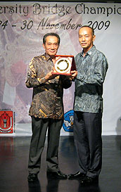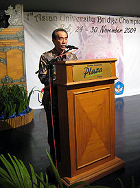 After the dance, the participating teams marched in. And then they listened carefully to the speech from Mr. Rustam Effendy, Chairman of The Organizing Committee, the speech from Mr. See Tow Cheng Fave, AUSF Treasurer representing the President of AUSF, and the speech from Mr. James Tangkudung representing the minister of Youth and Sport. Finally Mr. Harris Iskandar, representing The Minister of National Education, officially declared open the 1st Asian University Bridge Championship.