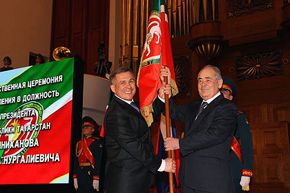 First President of Republic of Tatarstan Mintimer Shaimiev handed over the standard of Presidential Flag of Tatarstan edged with a fringe of gold color and emblem of the Republic to Rustam Minnikhanov.