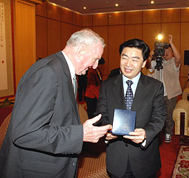 Mr. Killian offers Mr. Rong a FISU gift