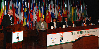 VIGO – Today, June 21st, the 10th edition of the FISU Forum was opened with splendor. After a welcome word from the Chairman of the Organizing Committee, Mr. Salustiano Mato de la Iglesia, the Rector of the University of Vigo, the Spanish flag was marched in while the Spanish national anthem was played. At the presentation of all participating countries, the volunteers marched in the flags of the different nations, 74 in total.