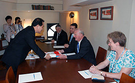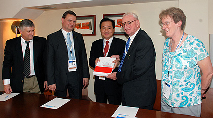 VIGO – Today, June 21st, Mr. Yoon-Suk Kim, Vice-Chair and Secretary-General of the Organizing Committee of the 2015 Summer Universiade in Gwangju, Korea (GUOC), delivered the Masterplan for the 2015 SU to FISU President Killian. As the future host of the Summer Universiade is present with a delegation at the FISU Forum in Vigo, it was a perfect occasion to hand over the Masterplan to Mr. Killian.