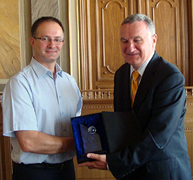 The Vice-Mayor receives a FISU souvenir from FISU Assessor Dymalski