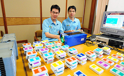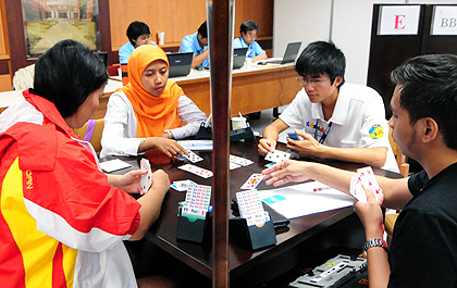 When focus on the game results, you might like to know a particular work on dealing. The supervisor, David CHU, together with Chu-Kai LIU and Dong-Jian LIN who are the volunteers of National Sun Yat-sen University took charge of the dealing work and used the “dealing machine” to duplicate each deck of cards which is conducted by computer program. It really takes time and they can finish 120 decks in one hour. The total dealing used in this event is 3,012 (14×16×13+100).