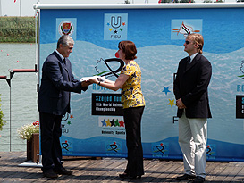 The flag was handed over to the next Organizing Committee of the 12th World University Championship in 2012 which will be hosted in Spain. The FISU flag was accepted by the Vice-Rector of the University of Girona, Prof.Dr. Jésus Garcia Gil, who welcomed everybody to attend the 12th edition of the WUC Rowing in Banyoles. A short promotional video was also shown to all participants.