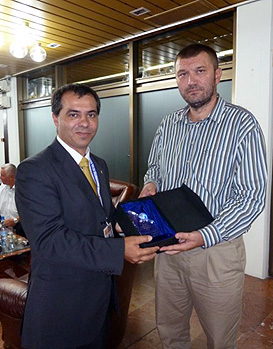 After the official programme of the Opening Ceremony all FISU Family guests, team leaders, judges and the members of the Organizing Committee were invited to the welcome cocktail organized by the President of the Organizing Committee. At this occasion Mr. Pedro Dias presented on behalf of FISU the Mayor of Novi Sad with a commemorative plaque for the hosting of the 12th WUC Futsal. The award was received by the Assistant of the Mayor Mr. Vitomir Vuckovic.