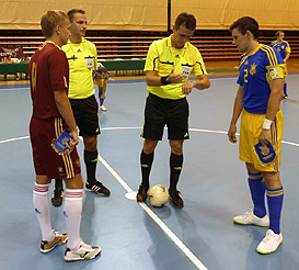 UKR vs. RUSThis game was important to establish the final ranking of pool C. UKR started better and player N° 10 Sorokin opened the score after two minutes. It was a very high level of futsal when the players moved up and down and tried to score goals. In the fifth minute of the first half one of these fast actions finished with the ball in the UKR net. A combination of all players of the Russian team ended with a goal by N° 2 Kutuzov. Team Ukraine scored again first but this time to the wrong net, the second goal of the Russian team was an own goal of UKR player Zinchenko. In the second minute of the second half the Russian scored; Goncharov ends off the combination T-T-T by a third goal for his team. Five minutes later Sergeev over shot from twelve meters everyone who was in the line of his fire, 4-1 for Russia. Zhurba (UKR) corrected the score 4-2 at the 31st minute.