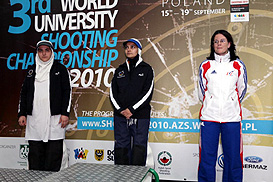 Medal Podium 10m Rifle WomenA high level of the shooting results and the biggest number of shooters (52) could be observed in the discipline 10 m Rifle Women. The level of competition can be compared with the level at a European Championship or ISSF World Cups. The individual gold medal went to Marian TALEBI (499.8) and silver medal was awarded to Magdalena JAMBOZORG (498.9) both from the Islamic Republic of Iran. The bronze medal went to Marie-Laura GIBBON (FRA) with 498.8 points.