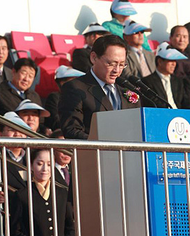 Mr. ChowHe then gave the floor to Mr. Kenny Chow, FISU EC member, who thanked the governor and the minister of sports and Mr. You, KUSB President because of the importance they attach to the development of university sport. He also thanked the volunteers and the delegations on behalf of FISU President Killian. He stressed the fact that this championship is the last in a year dedicated the FISU World University Championships. A year full of positive experiences that no doubt will leave an unforgettable memory to many of our student-athletes. He then formally invited the Minister for Culture Sport and Tourism, Mr. Yu In-Chon, to open the Championship. A thunderous applause followed and then the FISU flag was hoisted.