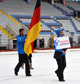 Ayse Zengin carrying the name board of GermanyAyse Zengin will carry the name board of the German delegation and is therefore the first to enter the stadium followed by some 3,000 participants, as Germany in Turkish is ‘Almanya’ with an ‘A’, the first letter of the alphabet. ‘I’m very proud and it makes me a little nervous’ she said. ‘It’s kind of special to me as I study German at the University and I will travel to Germany in the future.’