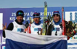 ERZURUM – February 5th – The “mass start” marked the end of the cross-country skiing competition at this Universiade; 15 km for the ladies and 30 km for the men, all in freestyle. The contestants, as well as the organizers and all those who worked for the success of this competition, had a wonderful impression of this last event, so magnificent were the racing conditions. The snow was good, the weather mild, and the course beautifully prepared. And that’s all it took for the Russians to polish off their masterpiece and win all the Men’s Medals. Indeed, Vladislav Skobelev gained is fourth Medal and his third Gold today. He was followed by Ilshat Nigmatullin and Andray Kalsin, all Russians skiers.