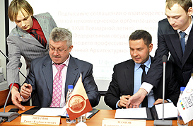 It stands to mention that Kazan State University of Architecture and Engineering became the fifth to sign the cooperation agreement with the Kazan 2013 Executive Directorate. The similar agreements were reached with Kazan State Medical University, Tupolev Kazan State Technical University, Kazan State Technological University and Institute of Economics, Management and Law.