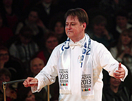 In the second half, after a magic performance of Dvorak’s Cello Concert and Brahms Symphony No. 4, all the 98 musicians tied Kazan 2013 logoed scarfes and Music Director of the State Symphony Orchestra and Honored Artist of Russia Alexander Sladkovsky put on a t-shirt with the KAZAN 2013 signature printed on it. The silence fell, the spectators were puzzled and there was a curiosity hanging in the air. With the first chords of Polovetsky Dances the audience saw a video presentation on Kazan’s preparations for the 2013 Summer Universiade projected on the walls of the concert hall. The performance delivered by the musicians proved once again that even the most outstanding representatives of the Republic and Russia were ready to contribute to promotion of the 2013 Summer Universiade.