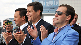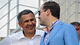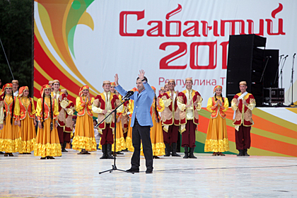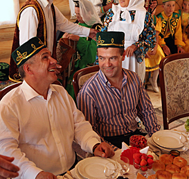 Earlier that day Dmitry Medvedev visited Sabantuy, the Tatar national holiday widely celebrated in Tatarstan following spring field work. Accompanied by Tatarstan President Rustam Minnikhanov, the President of Russia made a tour of courtyards featuring traditional handicrafts of different peoples ofRussiaand visited an improvised Tatar house where he tasted dishes of Tatar national cuisine.