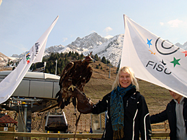 Kairis Ulp with a falcon at the Ski resort