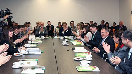 The results of the FISU Flag Relay that had travelled through 16 university cities of Russia this autumn were introduced to the President of Tatarstan. The presentation was made by Director General of the Kazan 2013 Executive Directorate Vladimir Leonov, FISU Flag Relay’s participants Alsu Saetova and Dinar Bariev, and representatives of two universities that had partnered with Team 2013 during the relay,Yeltsin Ural Federal University and Saratov State University. Specifically, the presenters talked about Kazan 2013 volunteer recruiting and training centres that had already been opened in 30 major universities ofRussia. On November 28-29 representatives of these centres gathered in the capital of Tatarstan to discuss the system of recruiting, selecting and training Kazan 2013 volunteers in the regions of Russia.