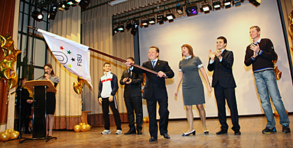 The solemn FISU Flag replica handover ceremony took place in the municipal children and youth creativity centre and saw the participation of Nizhnekamsk Mayor Aidar Metshin, Chief of Staff of the Kazan 2013 Executive Directorate Larisa Sulima, President of the Tatarstan Student League Timur Suleimanov, Chairman of Nizhnekamsk’s Student Council Igor Komissarov, master of sports, international class in freestyle wrestling Ildus Giniyatullin, scholarship holders and best students of higher education and secondary specialized education establishments of Nizhnekamsk. Minister of Energy of the Republic of Tatarstan Ilshat Fadeev attended the ceremony as an honorable guest.