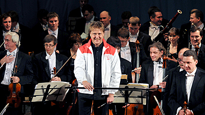 Maestro Alexander Sladkovsky appeared on stage wearing the jacket of the Kazan 2013 Ambassador