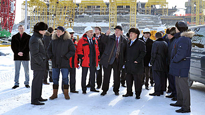 KAZAN – On Friday, March 16, Tatarstan President Rustam Minnikhanov visited the construction site of the 45,000-capacity football stadium being built in the run up to the 27th Summer Universiade and held a working meeting in the site office to discuss the facilities the stadium will be equipped with. The President was joined on his inspection tour by Prime Minister of Tatarstan Ildar Khalikov, Kazan Mayor Ilsur Metshin, Director General of the Kazan 2013 Executive Directorate Vladimir Leonov and other officials.