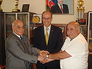 Handshake after signing the contract: Aghajan Agbiyev, Leonz Eder & Tofiq Khanaliyevscussed.
