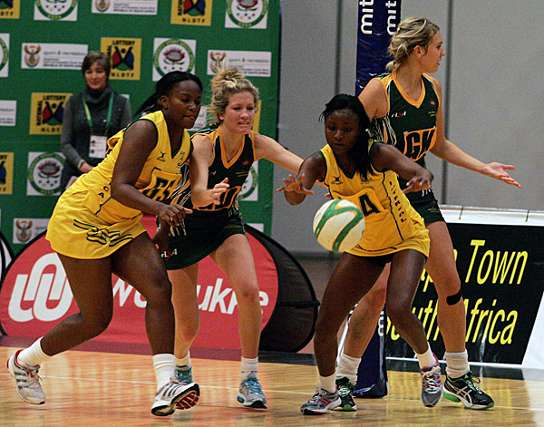 Jamaica’s Goal Shooter Vanessa Walker and Goal Attack Naudia Brown in action against South Africa’s Goal Defence Karla Mostert and Goal Keeper Vanes-Mari du Toit in the first match of the day of the WUNC on Friday