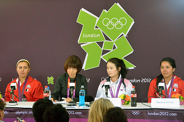 Aida Roman (MEX), silver and Ki Bo Bae (KOR), gold in women’s archery and former Shenzhen SU participants at the press conference in London (Photo: C. Pierre/FISU)