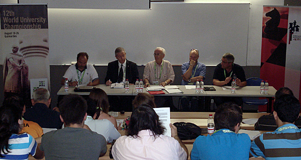 GUIMARAES – The 12th World University Championship of Chess is about to start. On 19th August all the participants took part in a technical meeting to establish all the rules of the tournament and to be introduced to the major names of the organization such as Eugen Fleischer, chair of FISU Chess Technical Committee, Kadirhan Sunguroglu, member of FISU Medical Committee, Geoffrey Borg, FIDE, Fernando Parente, Secretary General of Organizing Committee and Carlos Dias, member of Portuguese Federation of Chess.