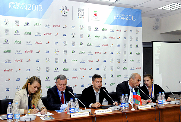 Director General of the Kazan 2013 Executive Directorate Vladimir Leonov, FISU Director for the Summer Universiade Marc Vandenplas, FISU Executive Committee Member Marian Dymalski and Ambassador for the 2013 Summer Universiade Sergey Ulegin took part in the press conference announcing the beginning of the Championship.