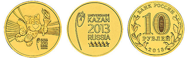 The Central Bank of Russia is also going to put into circulation two kinds of 10 ruble base metal coins to mark the 27th Summer Universiade Kazan 2013.