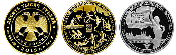 KAZAN – The Central Bank of Russia has issued commemorative coins dedicated to the 27th Summer Universiade Kazan 2013. Silver 3 ruble and 25 ruble coins and gold 50 ruble and 10,000 ruble coins are soon to appear in banks of Russia.