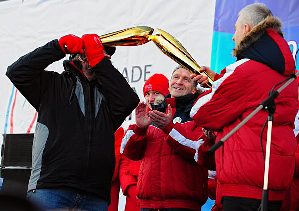 Oleg Matytsin receives the flame from Anatoly Vasilyev of the Sedov