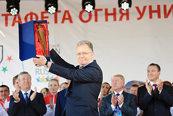 To commemorate the Universiade Torch Relay in Izhevsk, Andrei Yasko presented the city leaders with souvenir torches.
