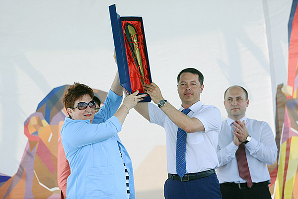 Tamara Devyatkina receives a souvenir torch from Tatarstan Minister Artyom Sidorov