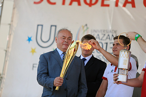 Chairman of the State Assembly of Bashkortostan Konstantin Tolkachev holds the Torch while it’s being lit