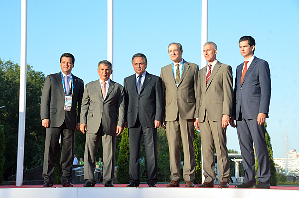 Kazan Mayor Metshin, Tatarstan President Minnikhanov,, Russian Minister of Sport Mutko, FISU President Gallien, RSSU President Matytsin & Village Mayor Abdulganiev
