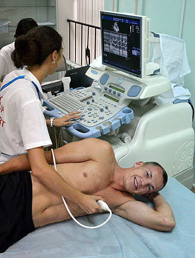 Martin Zacests, student-athlete from Latvia (track and field) during the echocardiogramBetween June 30th and July 9th, athletes at the 27th Universiade were invited to submit to a heart and health test. Everyone who came forward received a blood pressure test, an electro cardiogram and echocardiogram. These data were coupled with a health questionnaire. The athletes were then evaluated based on the results and divided into four categories: normal, with minor defects that do not require specific monitoring, with abnormalities requiring follow-up, and finally with abnormalities with cessation of all competition sport recommended (the proportion of athletes in this category is estimated at less than 0.5%). A USB key containing the evaluation was then given to each athlete.