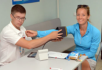 The blood pressure checkTo do so, a large-scale study had to be set up and what better place and time frame than the Universiade to implement this type of research. In Kazan, this objective has been achieved since the operation was a great success with more than 1,500 analyses. It may even resume shortly before the closing of the Games. Indeed, this kind of research has to take place prior or after competition and not during because the result could be influenced by the stress generated by the competitions.