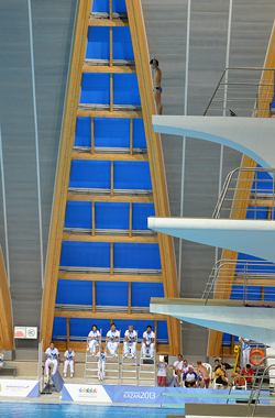 KAZAN – The men’s 10-meter platform diving competition is truly a spectacle. Climbing three flights of stairs to the top platform, the 16 divers competing in the preliminary stages of this year’s Summer Universiade defied gravity with an array of tucks, twists and tumbles as they gracefully entered the water from the dizzying height with a minimal splash.