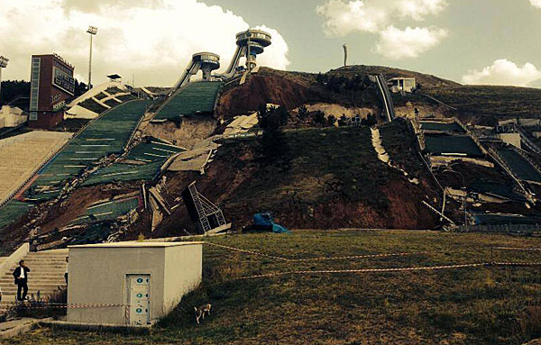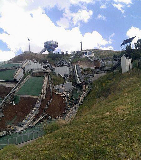 ERZURUM – A landslide in Turkey’s Erzurum, host city of the 2011 Winter Universiade, has severely damaged the Türk Telekom Ski Jumping Towers, one of the most modern ski jumping venues in the world. The ski jumping venue is located on the Kiremitlik Hill at the base of Palandöken Mountain just southwest of Erzurum. The images of the disaster are impressive. The landing areas of the five jumps were almost completely destroyed. Fortunately there were no casualties, nor wounded.