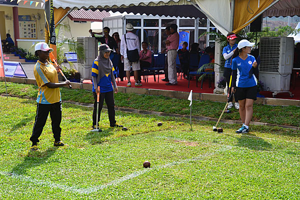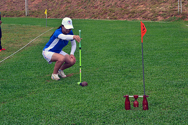 PERLIS – The 4th World University Woodball Championship kicked-off this Wednesday with the first half of the team stroke competitions for both men and women. Thailand, one of the favorites of the competition showed immediately how well prepared they are taking the lead in both men’s and women’s after the first half of the competition. In this competition where the four best scores of each team count, Thailand took a clear lead in the men’s competition with a cumulated score of 418 ahead of Malaysia (455) and Hong Kong, China (458). This was also the moment for two players to clearly demonstrate their domination, namely Ahris Sumariyanto (INA) and Peera Chaisongkram (THA) with respective scores of 94 and 99 – 2 below and 3 over the par of this course (96) – 5 stroke less than the majority of their opponents.