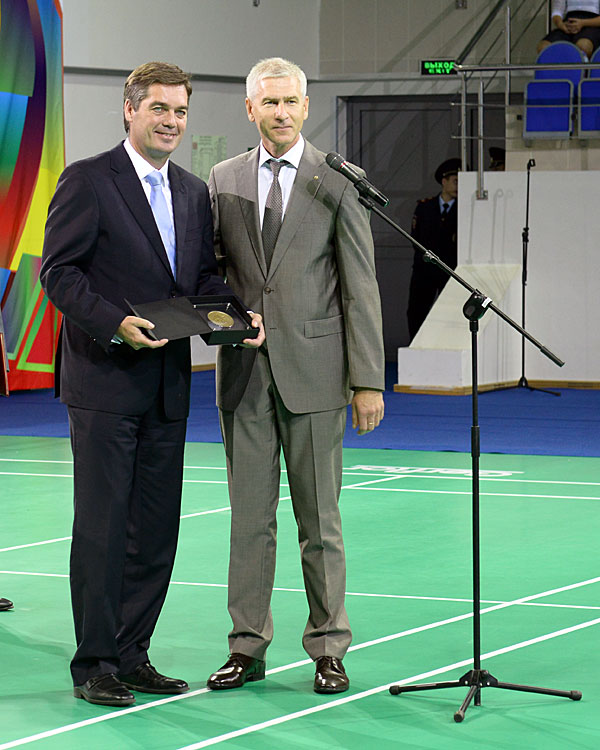 In conclusion of the ceremony The President of the National Badminton Federation Sergey Shahrai gave a speech. “Badminton is the sport of cosmic speed. Badminton is the sport of intelligent people. Badminton will develop with the help of the students and universities. Badminton for students is our future. That’s why the first master of Badminton in Russia is Yuri Gagarin who is the first person in space. I would like to thank the Governer, the Minister of Sport and sincerely thank Paul Eric Hoyer Larsen who came from Brazil to see the Opening ceremony of the FISU World University Championship. My friend Oleg Vasilievich Matytsin put the soul into organizing this tournament in our country! Hooray! The World University Championship!”
