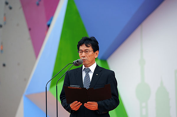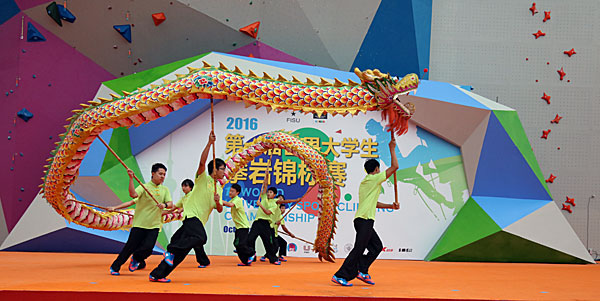 At 9 am, uplifting beats of drums blares out from the gym of the university, while a splendid dragon dance starts, followed by martial arts performances. Energetic cheerleaders dance passionately on the upbeat music. The opening ceremony is full of vigor. After the wonderful performances, all the people stand up to witness the flag-raising ceremony. And then the host of the Dragon TV introduces the distinguished guests present in the opening ceremony. Jin Haiyan, the deputy party secretary of Donghua University welcomes the competitors from 17 countries. FISU EC member Hisato Igarashi addresses the participants and expresses his sincere thanks to Donghua University and FUSC for all the efforts they have made. FUSC Vice-President Yang Guoli declares the opening of the 1st World University Sport Climbing Championship. The opening ceremony ends with the song ‘I Believe’ performed by China’s fastest climber Zhong Qixin and Shanghai singer Luo Yun.