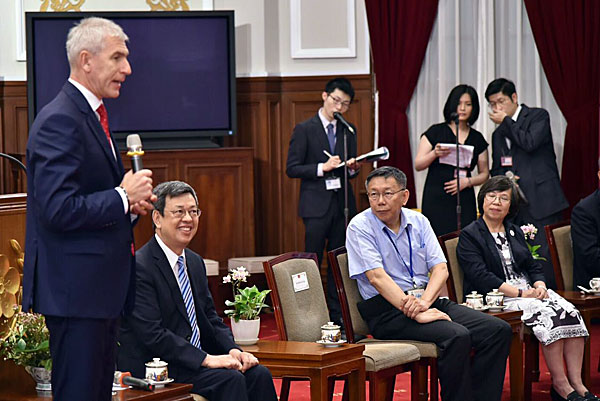 The FISU President with from left to right: Chen Chien-Jen, Vice President of Chinese Taipei, Ko Wen-je, Taipei City Mayor, SU Li-Chiung, CEO of the Taipei Universiade Organising Committee (TUOC)