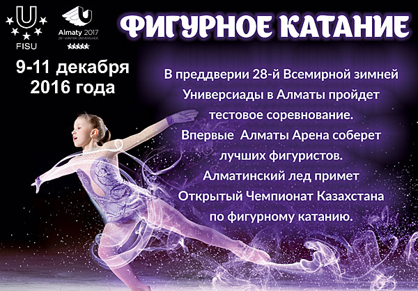 ALMATY – From 9 to 11 December, 2016 the new ice palace “Almaty Arena” will hold the Kazakhstan Figure Skating Open Championship among youth, junior and adult classes. This competition serves as a test event prior to the 28th Winter Universiade 2017 in Almaty.