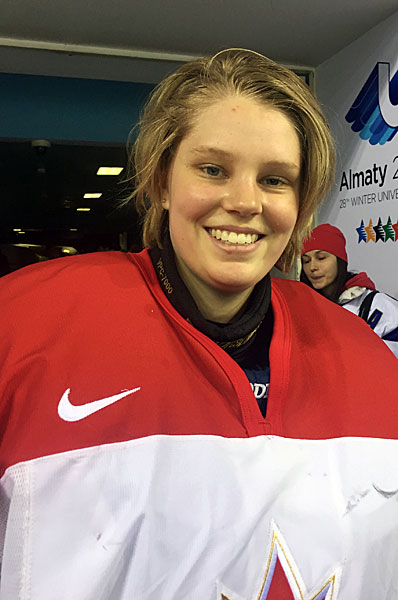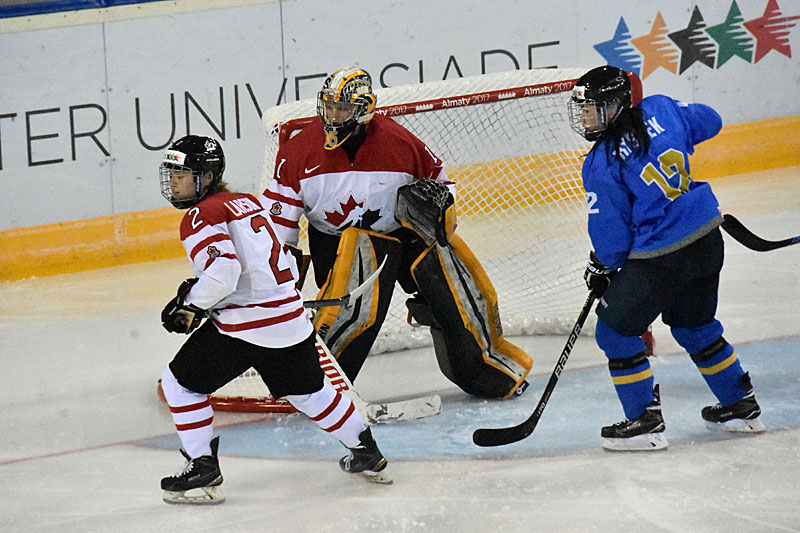Having three victories, two with double digits on the scoreboard, under the belt does not make Canadian goalie Stephanie Sluys from the University of Waterloo slack in her net. “Today it was definitely easy to get pumped for the game with this boisterous crowd, even when they were obviously cheering for Kazakhstan, and it’s nice to hear people cheering. I’ve never played in front of so many people. The energy here is awesome.” Sluys experiences the Winter Universiade as a ‘ton of fun’. “The Athletes’ Village is fantastic, the action is great. The team is bonding great. It’s funny because we’re all rivals as we play against each other but here we’re one team.”