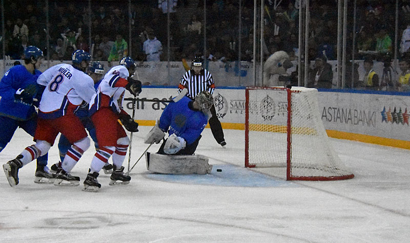 Kazakhstan once again confirmed its status of contender with another victory. In front of a boisterous sell-out crowd at the Halyk Arena, Team Kazakhstan beat Czech Republic in an upscale game. Leading only by one goal in the first period, the Kazakhs quickened the tempo gradually netting more pucks. However, the Czechs were no easy opponent with 21 shots vs 38 on goal. A number of excellent saves from Kazakh goalie Kudryavtsev prevented the Czechs from scoring. Final score: 0-8 (0-1; 0-3; 0-4).