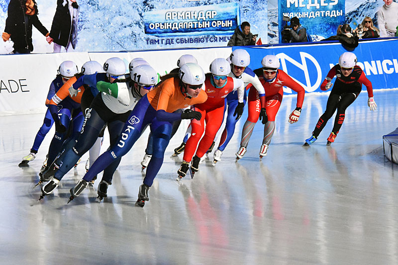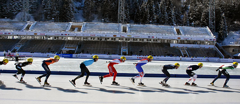 ALMATY – It was the perfect ending of the speed skating competition today, 6 February at the Medeu Mountain Ice Rink. The rink is located in a mountain valley on the south-eastern outskirts of Almaty and sits 1,691 metres above sea level, making it the highest skating rink in the world. Although below zero temperatures were measured, the sun was shining abundantly and the sky was coloured deep blue. The setting you want for a mass start race with 16 laps to go.