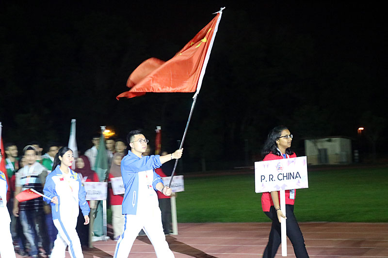 The Ceremony started with the matching pass of 12 participating countries and regions. With the teams standing in the venue and audiences at the stand, Dr. Abdullah Mohamad Said delivered his welcome speech on behalf of the Organizing Committee, welcoming all the participants and wishing them enjoying the stay in Malaysia. In the following, Dr. Omar A. Al-Hai on behalf of AUSF expressed the appreciation to all the teams for their coming and to the host for their hospitality and great efforts. He highly praised the preparation of both events by Malaysia University Sports Council, supported by Ministry of Higher Education, University Sains Islam Malaysia, Archery Federation of Malaysia and Malaysia Basketball Association. He said that the Championship was not only for competition, but also a good platform to bring youth across the Asia together. He also boosted the confidence of Asian member federations, by reviewing the contribution Asian member federations made for the international university sports movement in the past. As the highest authority, Dr. Mary Yap Kain Ching, Deputy Minister of Higher Education declared the opening of the 1st Asian University Archery Championship and 3rd Asian University 3×3 Basketball Championship after a short speech. She said that the championship was not only a place to exchange ideas, but also a platform to enhance their competitive skills and performances. She wished all the participants could value this opportunity, have good performances and soar upwards.