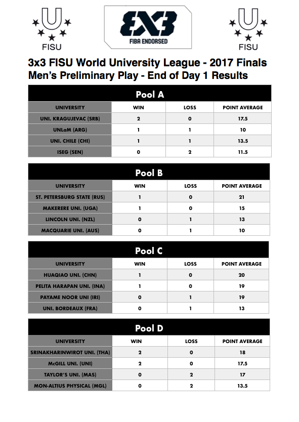Men’s results after Day 1 of the 3×3 FISU World University League – 2017 Finals
